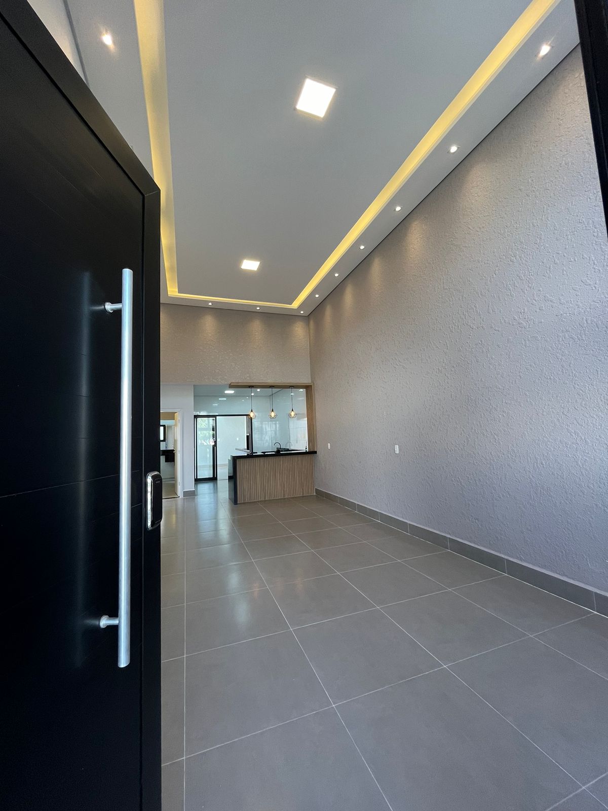 * Salas de estar e jantar em espaço aberto, com detalhes na iluminação do teto.