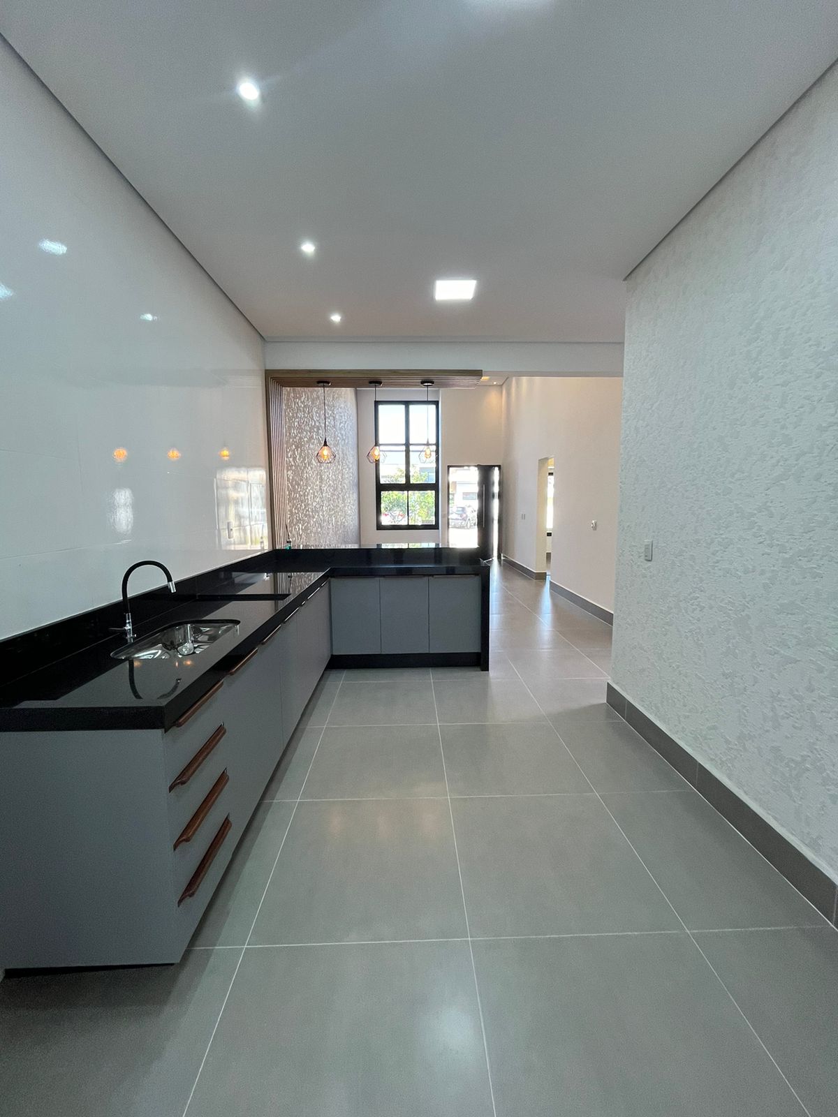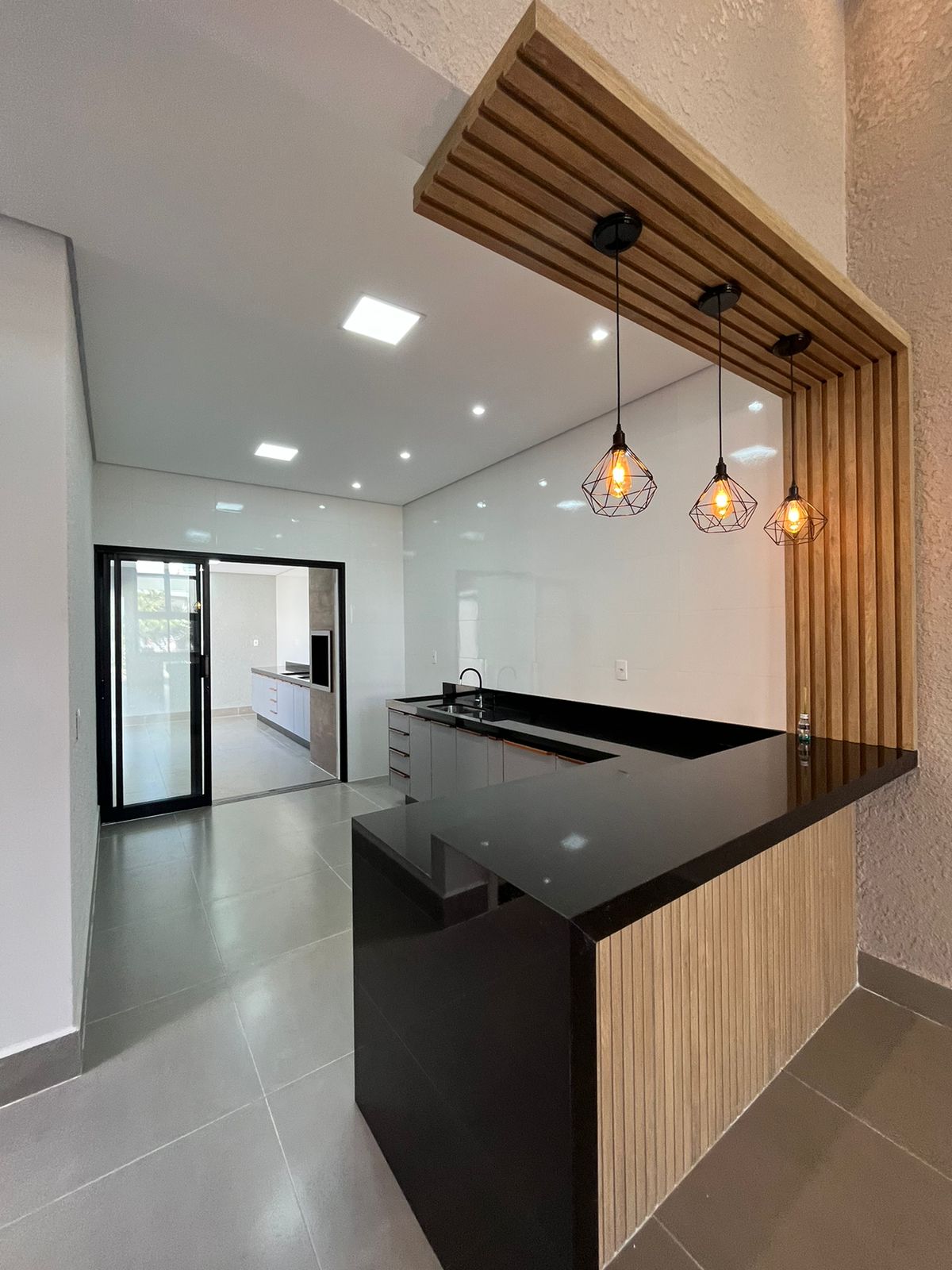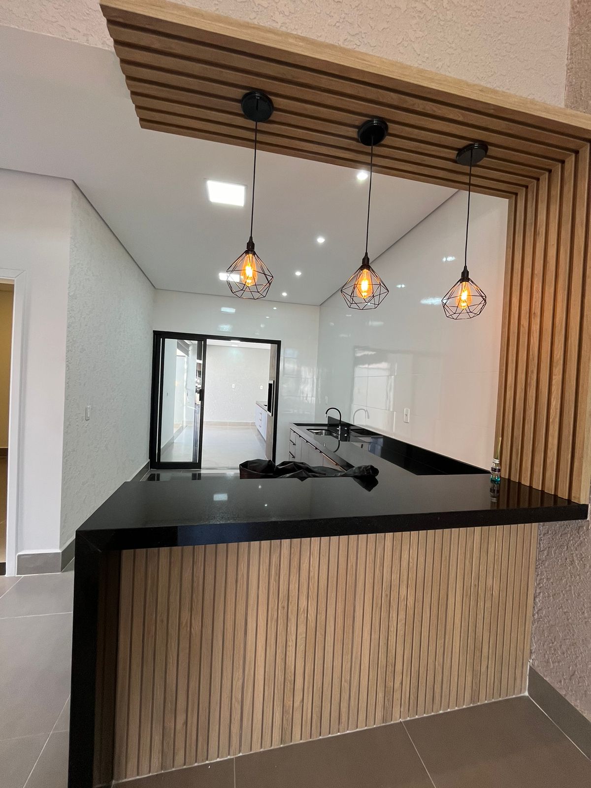 * Cozinha com pia e balcão em granito preto. O gabinete com gavetas e o balcão em detalhes de madeira com luminárias charmosas fazendo a diferença;