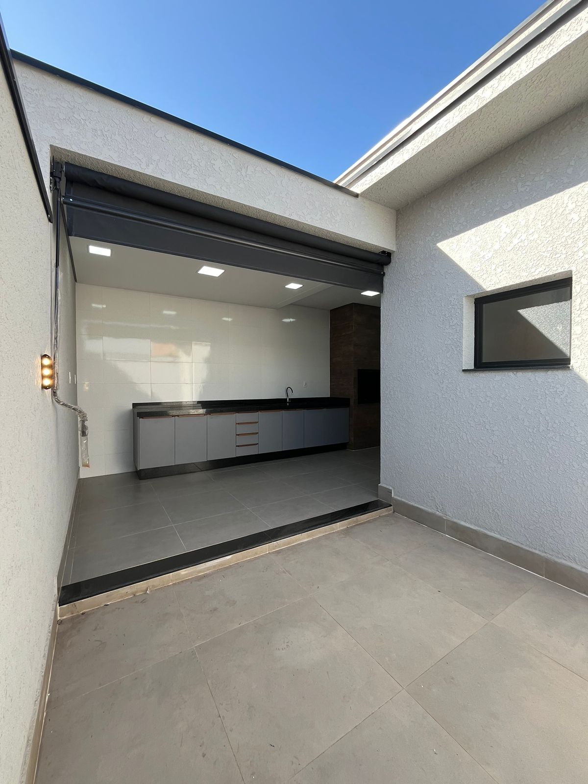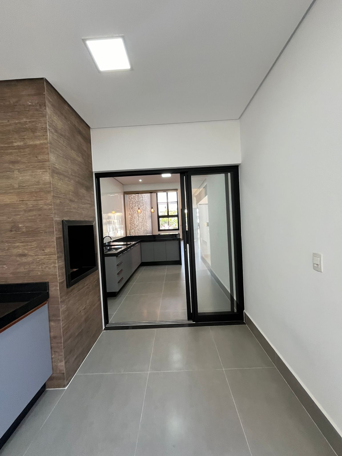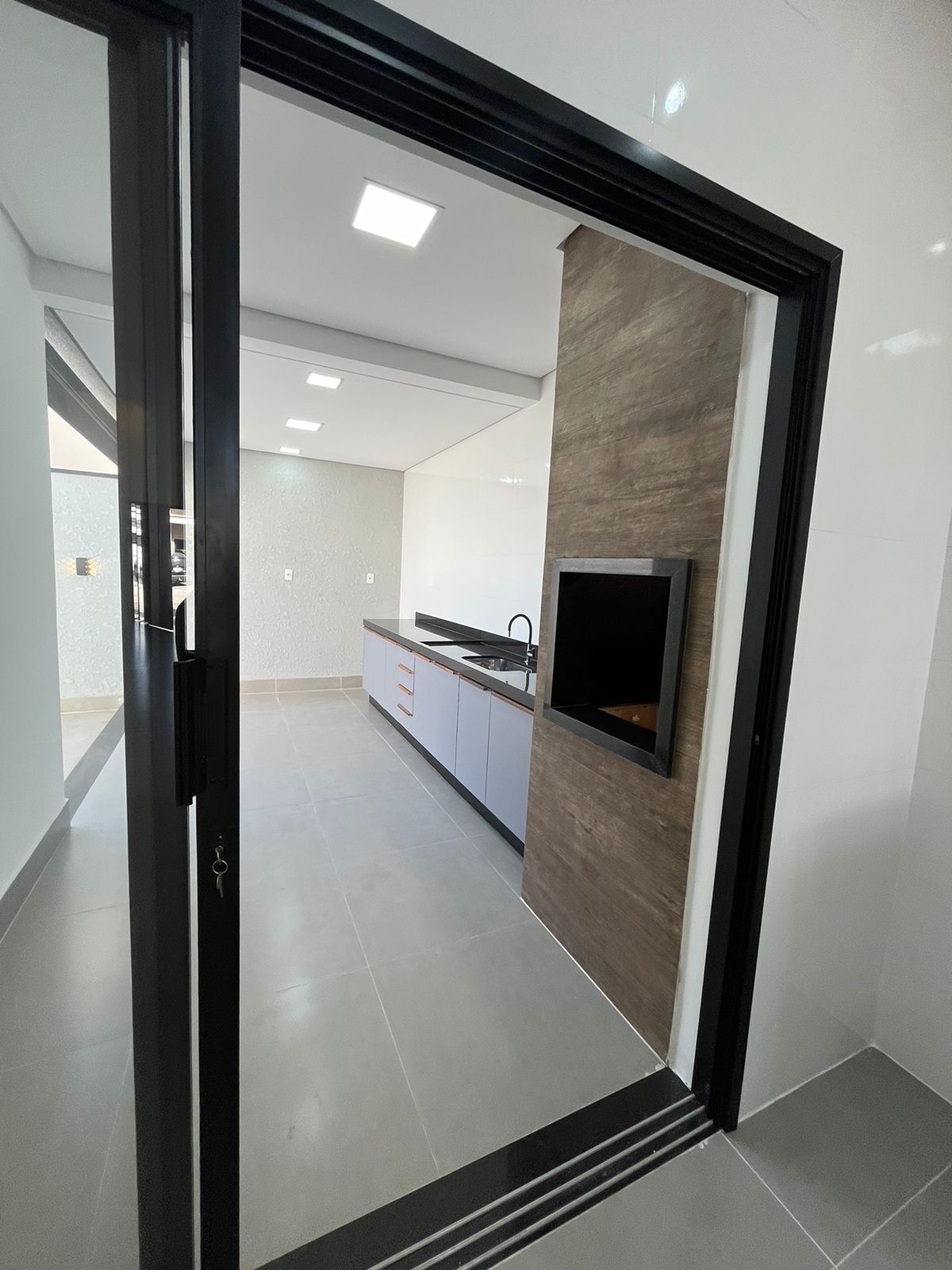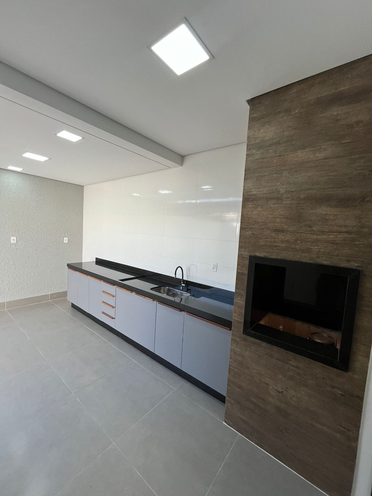 * Área gourmet com churrasqueira e pia em granito preto com diferencial no gabinete;